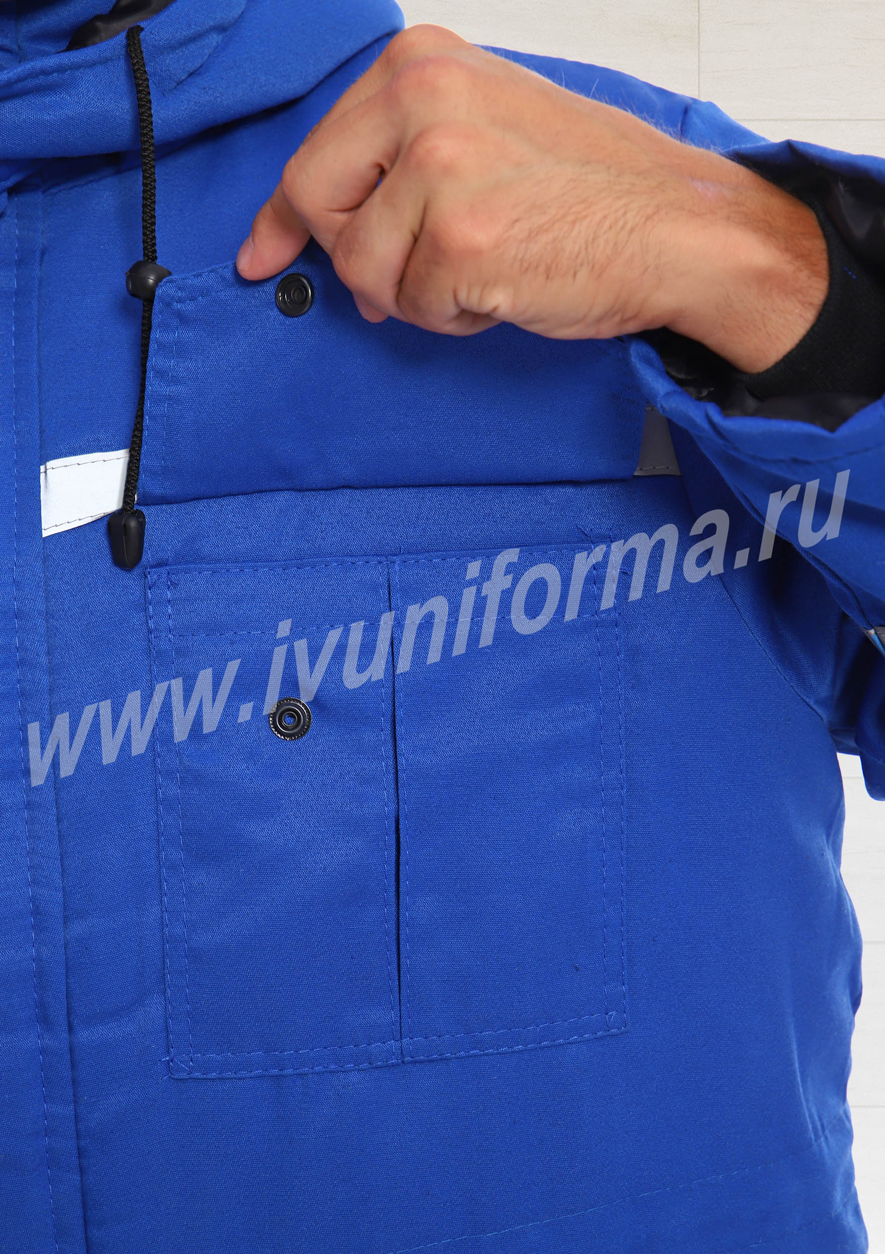 Костюм мужской для скорой помощи состоит из куртки и брюк. Куртка средней длины с воротником стойкой, с центральной застежкой на молнию и ветрозащитной планкой на кнопки. Для регулировки объёма куртка имеет кулису на уровне талии. На куртке два фигурных нагрудных кармана с клапаном на кнопке и два нижних прорезных кармана. На передней части, спинке и рукавах светоотражающие ленты. Утепление куртки 450 гр/кв.м.